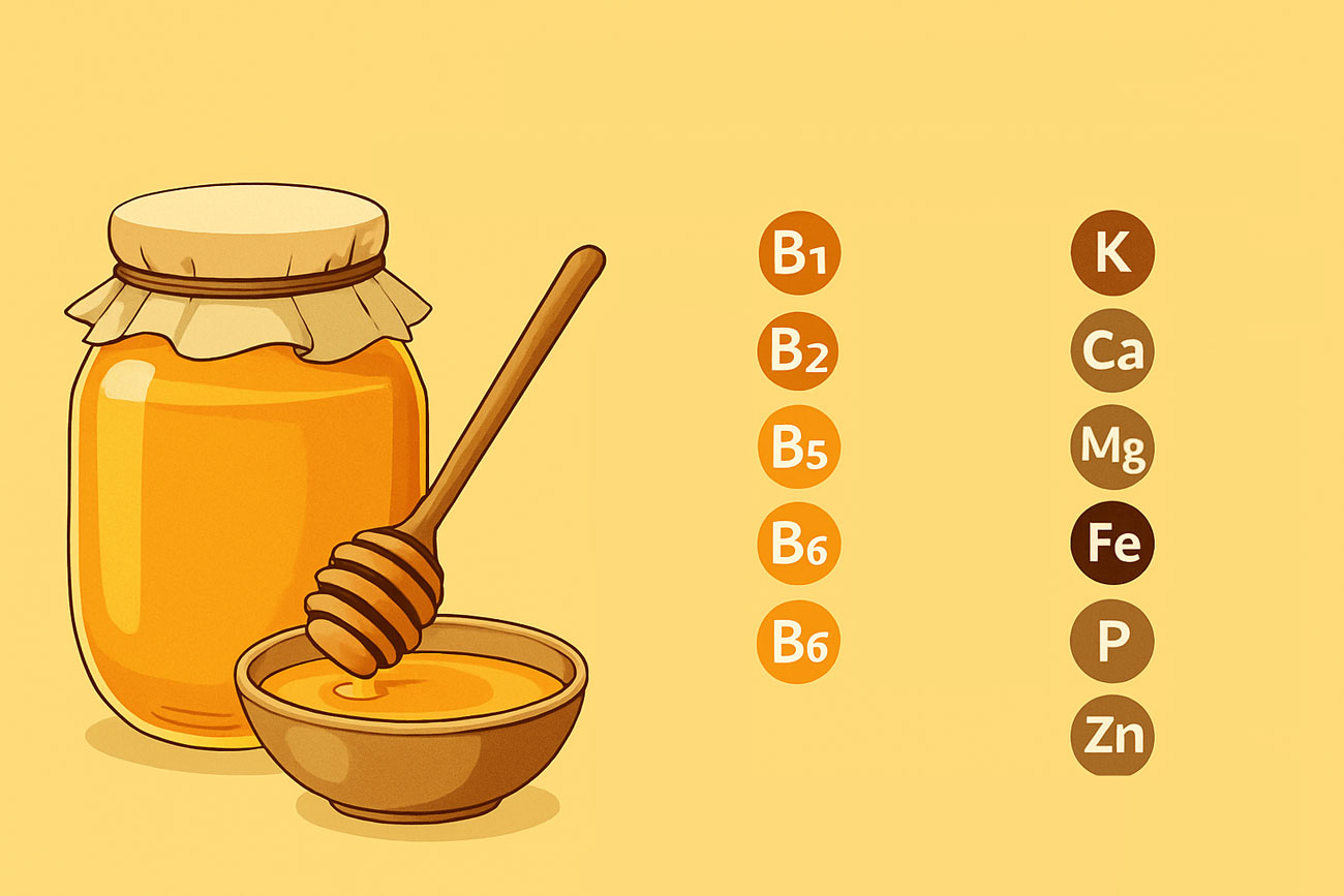 У меді присутні вітаміни у невеликих, але біологічно активних кількостях. Вони легко засвоюються організмом завдяки природній формі та поєднанню з іншими речовинами.